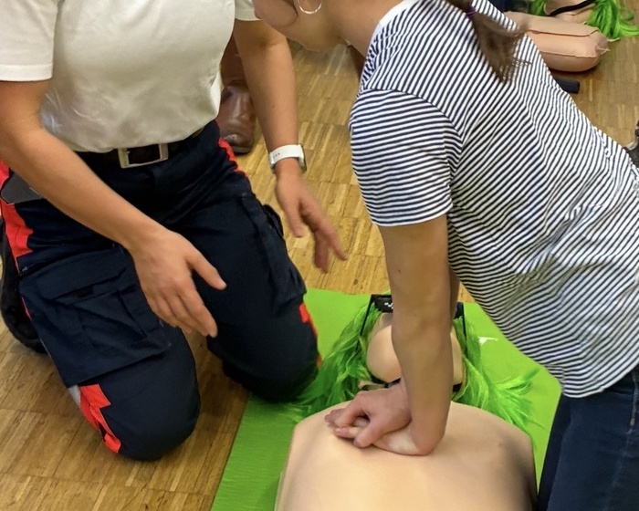 Am Mittwoch, vor Beginn der Weihnachtsferien, fand ein Reanimationstraining für die Klassen 5a, 6a, 7b, 8a und 9b statt. Frau Dr. Petra Hederer vom Notfallzentrum der Uniklinik Freiburg und ihr Team leiteten die Schülerinnen in der Herangehensweise einer Notfallsituation an. Die Klassen übten die stabile Seitenlage und lernten die so genannte „Laienreanimation“ kennen. Dabei geht es darum, Bewusstsein und Atmung zu prüfen, Hilfe zu rufen sowie den Notruf 112 zu wählen und dann ohne Zögern mit der Herzdruckmassage zu beginnen. Die Klassen waren sehr motiviert und konzentriert dabei. Das Lehrerteam war begeistert. Es ist geplant, dass im Verlauf des Schuljahres alle Schulklassen geschult werden. Wir freuen uns schon!Ein Hinweis von Frau Dr. Hederer für alle, die üben möchten: